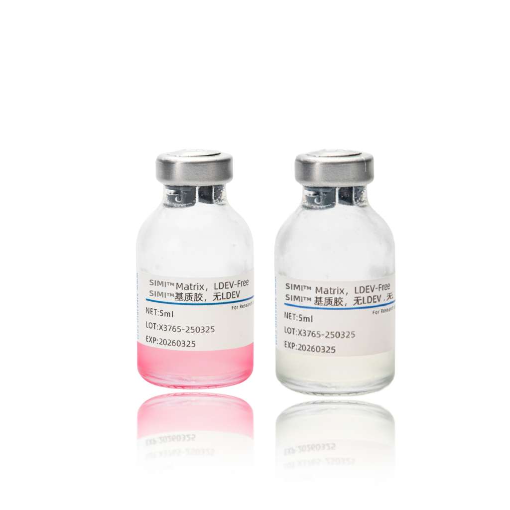 SIMI基质胶是由上海西酶生物科技有限公司(SIM BIO)提供的科研产品,小鼠肿瘤组织中提取的基底膜成分制备而成,。其核心成分包括层粘连蛋白、IV 型胶原蛋白肝素硫酸蛋白聚糖等,可以提供细胞黏附、分化和增殖所需的支持和信号,同时也可以模拟生理环境中基底膜的特性,提高细胞培养的成功率和效果。