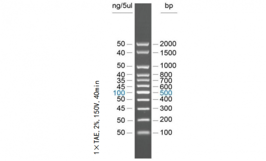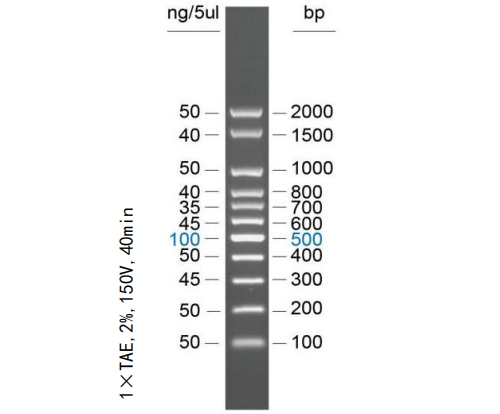 本产品由 100 bp、200 bp、300 bp、400 bp、 500 bp、600 bp 、700 bp、800 bp 、1000 bp、1500 bp、2000 bp 十一条 DNA 条带混合组成。条带中的 500bp 浓度为 20 ng/ul,显示为亮带,其余条带浓度为 10 ng/ul。可适用于判断琼脂糖凝胶电泳过程中 DNA 条带分子量 大小,产品中已含上样缓冲液和二甲苯青、溴酚蓝染料,便于观察电泳过程中迁移位置,可直接取用,无需加热。本产品推荐上样量为 3- 5 µl, 可根据孔径大小调整上样量。
